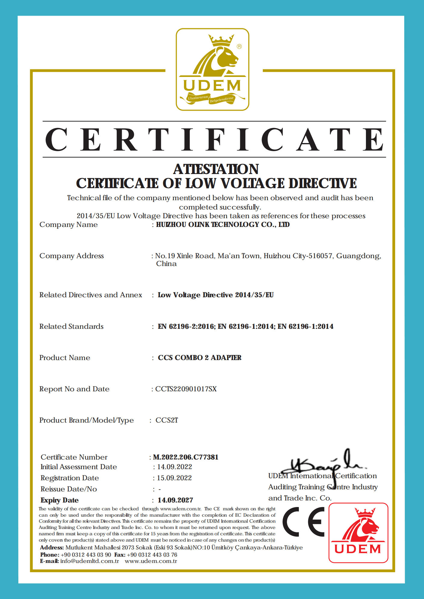 OLINK is a pioneering Chinese company and IATF16949 and IPC620 certified, specialised manufacturer focusing on electric vehicle power supply equipment and solving problems in the field of connectivity with more than 5 years of professional experience in this field. We position ourselves as a solution provider for the extreme demands of electric vehicle power supply equipment. This means that Olink places great emphasis on quality, performance, price, delivery, one-stop solutions and after-sales service. Our wide range of products includes EV adapters, EV chargers (AC and DCFC), EV extension cords, and EV charger connectors and sockets, all of which are CE, ETL, UL, FCC, and RoHS compliant.